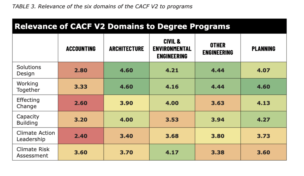 The survey explored the current status of CCE in professional degree programs in Canada, identifying barriers and opportunities and what supports are needed to accelerate this integration of CCE into professional programs. Drawing on the Canadian Climate Action Competency Framework developed by the Resilience by Design Lab, the survey provides a snapshot of what climate action competency domains are deemed to be most relevant to professions, and provides a “strong basis for the using the CACF to support the integration of climate competencies into courses required for students’ graduation and eventual professional accreditation” (p.17).